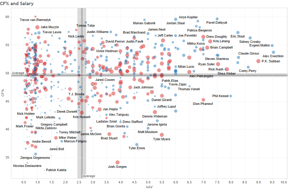 What is intriguing about graphing CA/60 and CF/60 is that four quadrants appear when the means and confidence intervals of the variables are applied. This illustrates the risk and reward of having these players on the ice. Depending on the game situation (leading, behind, close) certain players may be used for their strengths. It is no coincidence that a players like Bergeron and Kopitar are both in the top left corner, because of their low CA/60 and high CF/60 values. While Benn, Seguin and Tavares are in the top right, because they are less responsible in the shots against/60 category, but are also more prone to producing shots while on the ice. As one might expect, all of these players are fairly compensated for their performance on the ice.