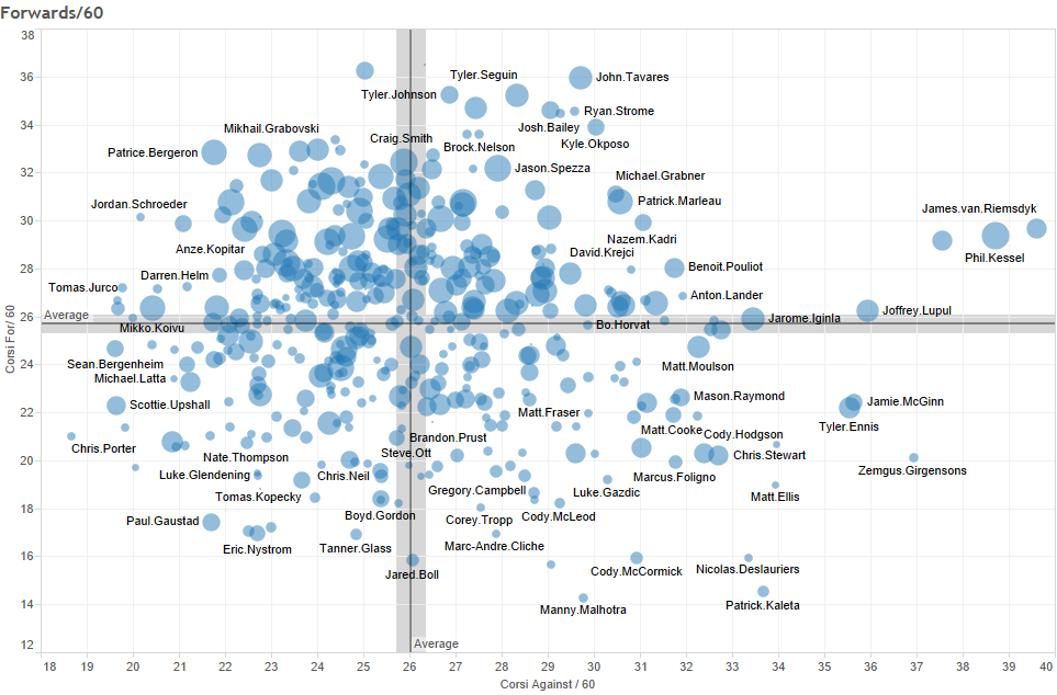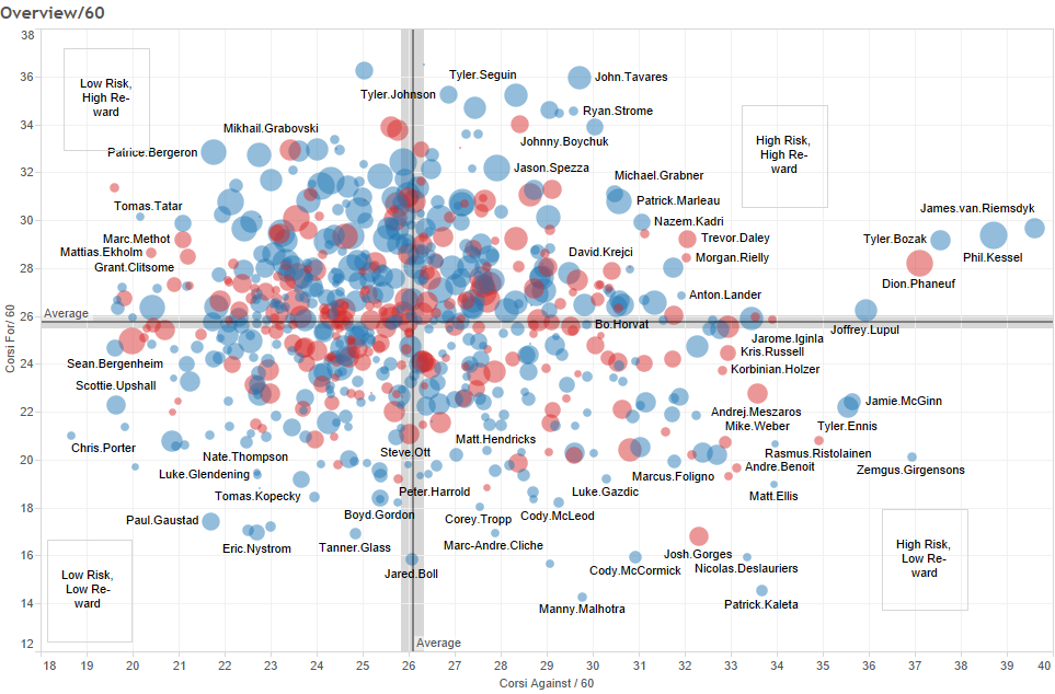 One of the other facets of these graphs is the annual contract value of the player, illustrated by the size of the player bubble. It is quite interesting that most of the highest payed players exhibit positive corsi scores. There are exceptions, notably teammates Phaneuf and Kessel, who are making 7 Million and 8 Million respectively, yet whose Corsi differentials were both over -200. On the other end of the spectrum, Leddy, Jones and Ekblad made collectively less than 5 million, and posted admirably high Corsi scores.