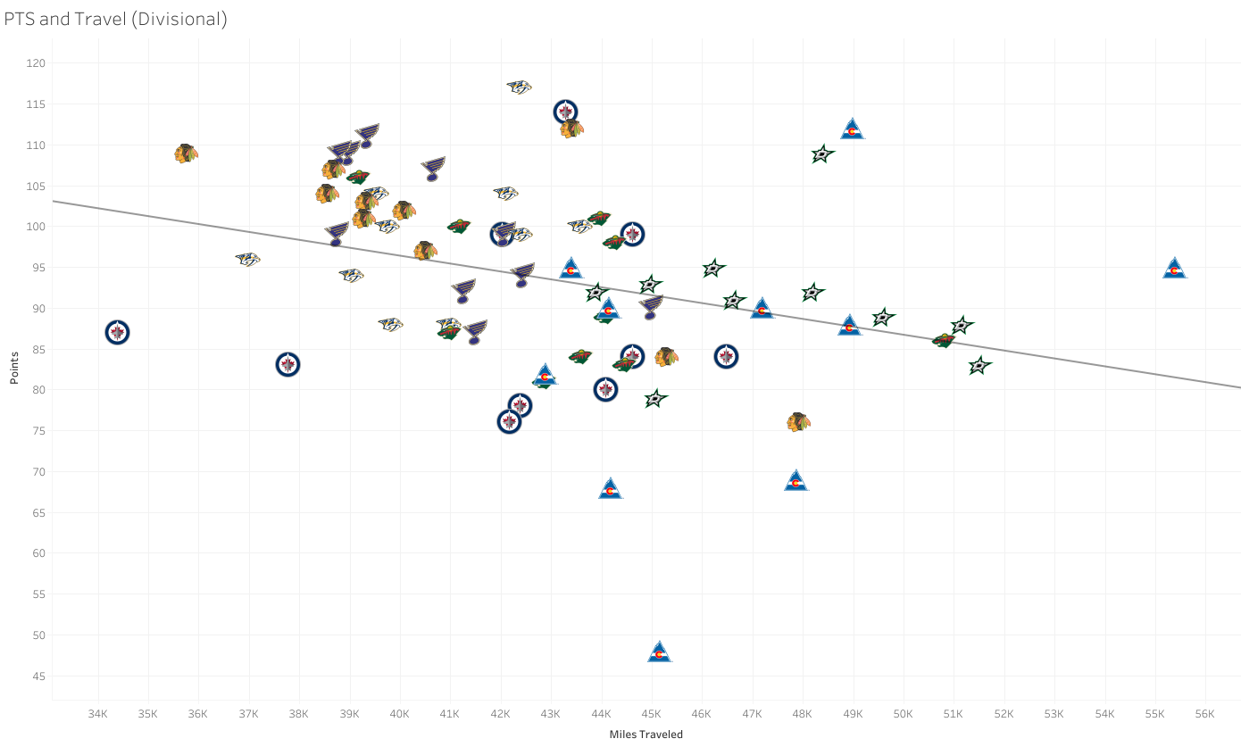 The relationship between travel miles and standings points – Central Division: