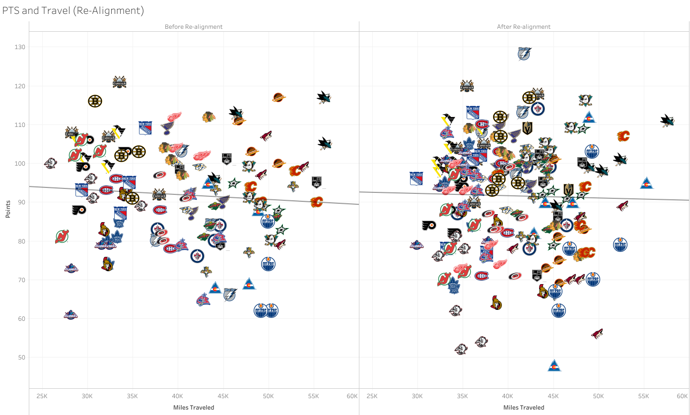 The relationship between travel miles and standings points – before and after re-alignment: