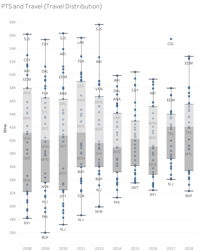 Travel distribution across NHL teams: