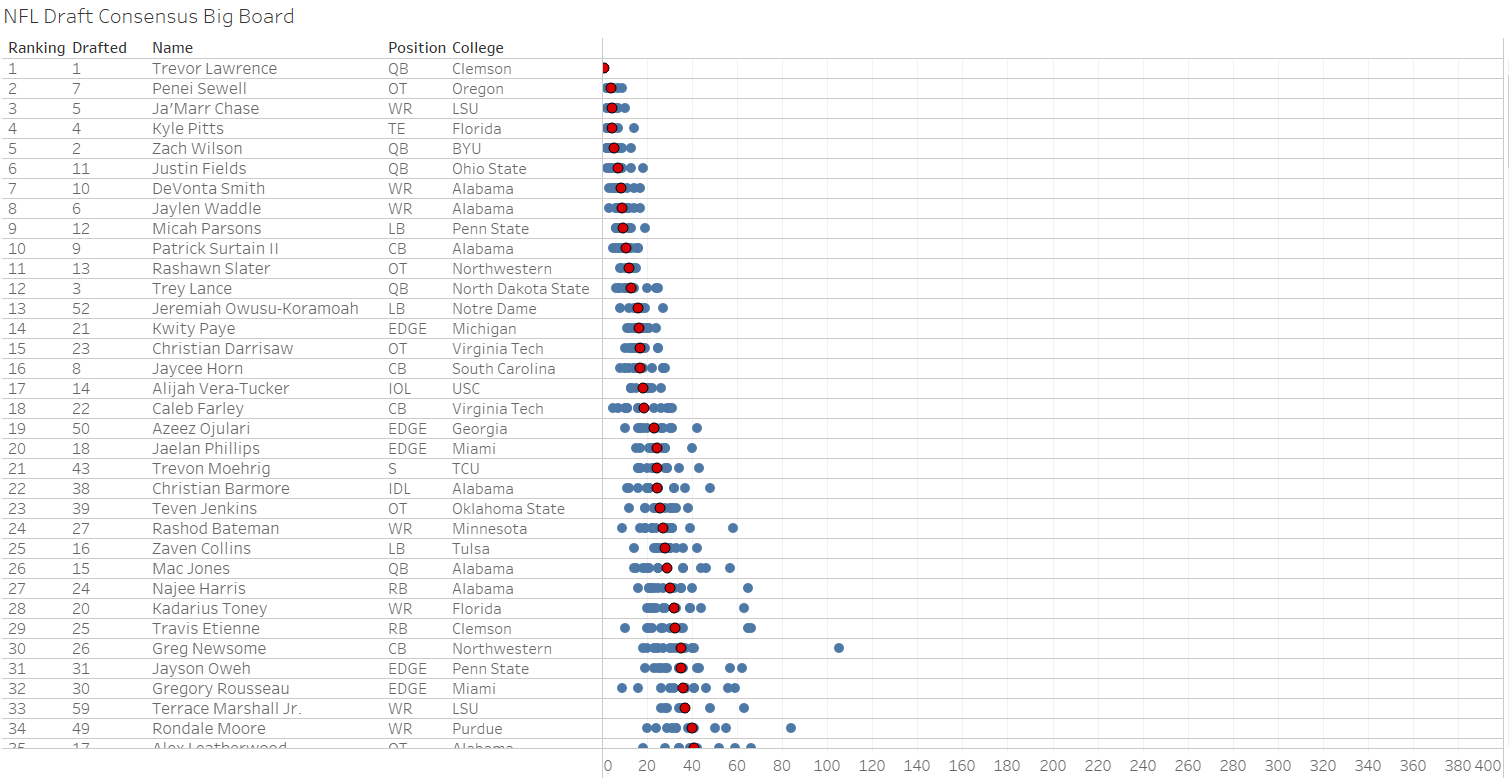 For those of you who were not aware of it’s existence, I compiled a “consensus big board” for the 2021 NFL Draft. Rather than looking at a big board from a single source, this “consensus board” calculated the average big board ranking from 14 of the biggest names, which included the following:
