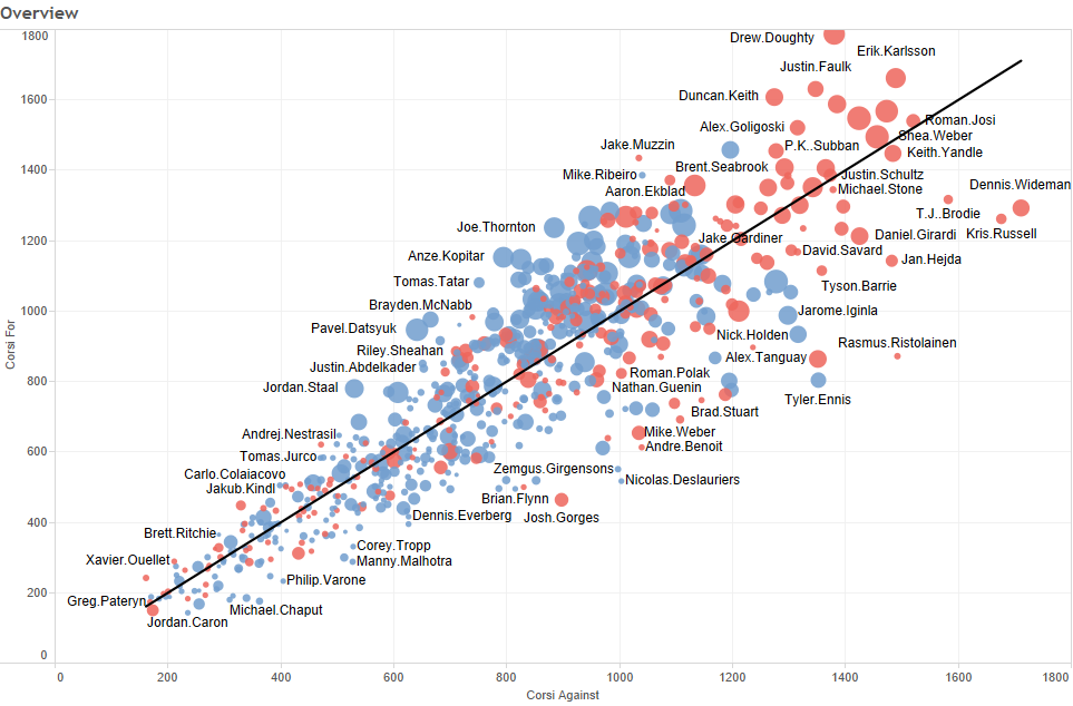 Thanks to war-on-ice.com, I was able to analyze the relationship between Corsi values (shots taken for/against while on the ice/off the ice) and annual contract values for players. First, I map the Corsi for (herein CF) and Corsi against (herein CA) values on a (x,y) plot. The size of the bubbles (for each player) are relative to the value of their contract.